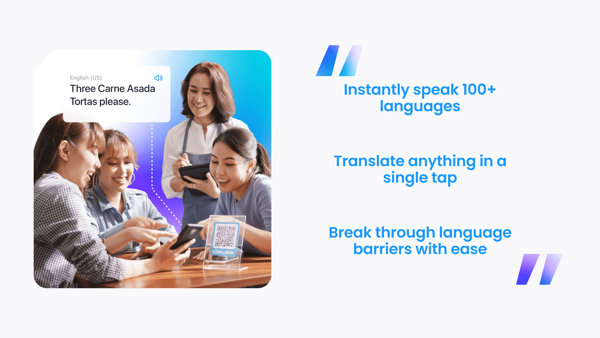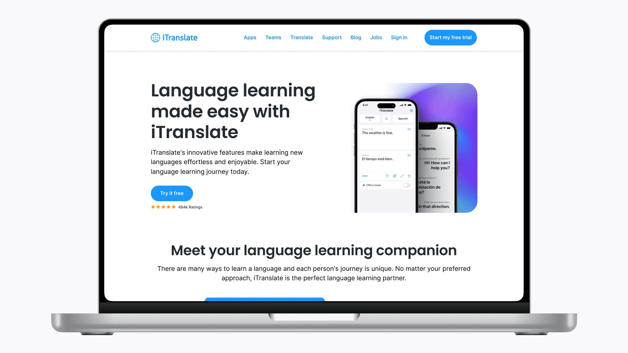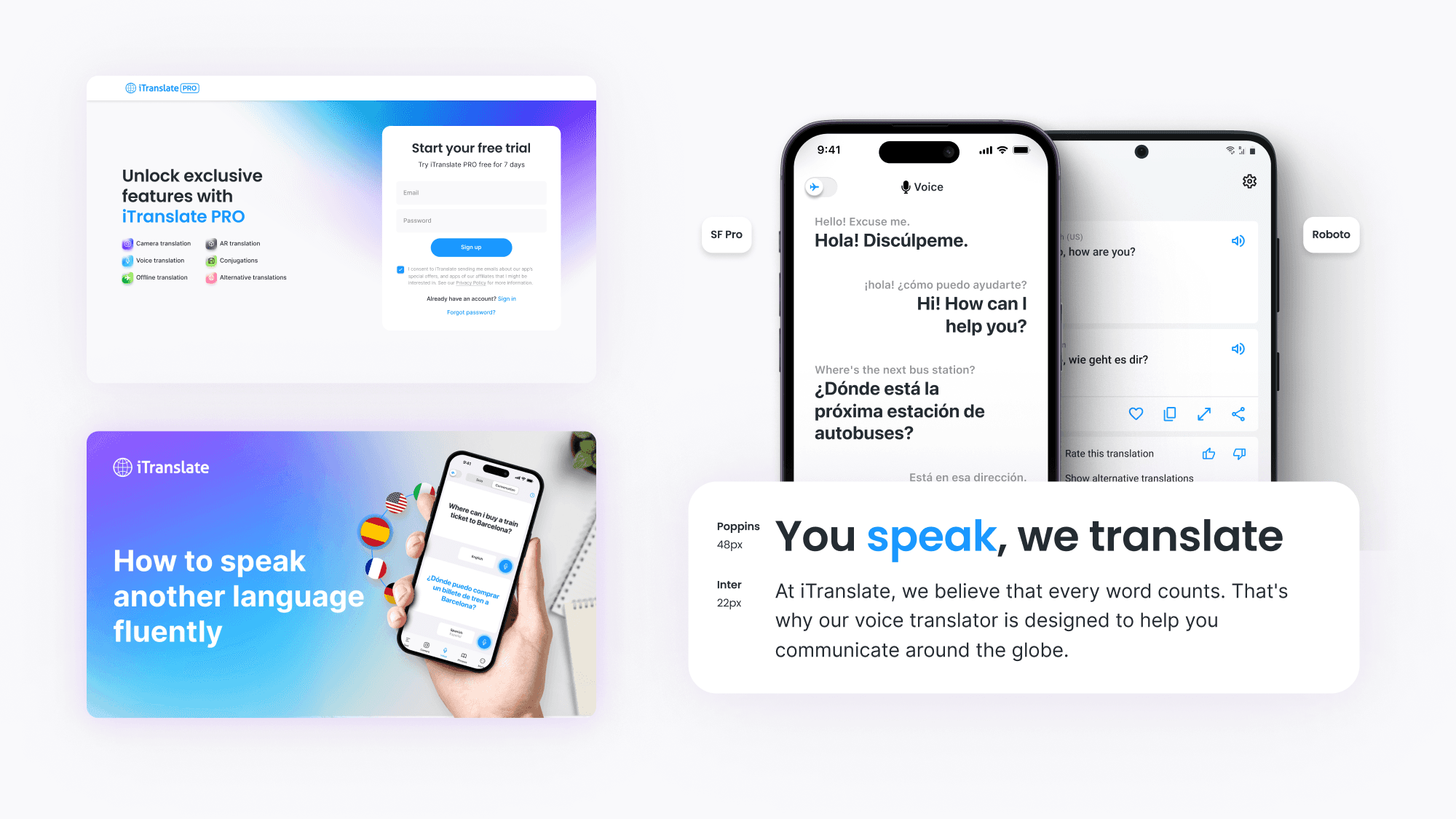 -> Simplified hero lockup to highlight the product name as an iTranslate sub-app, mission, app store rating and additional social proof if available