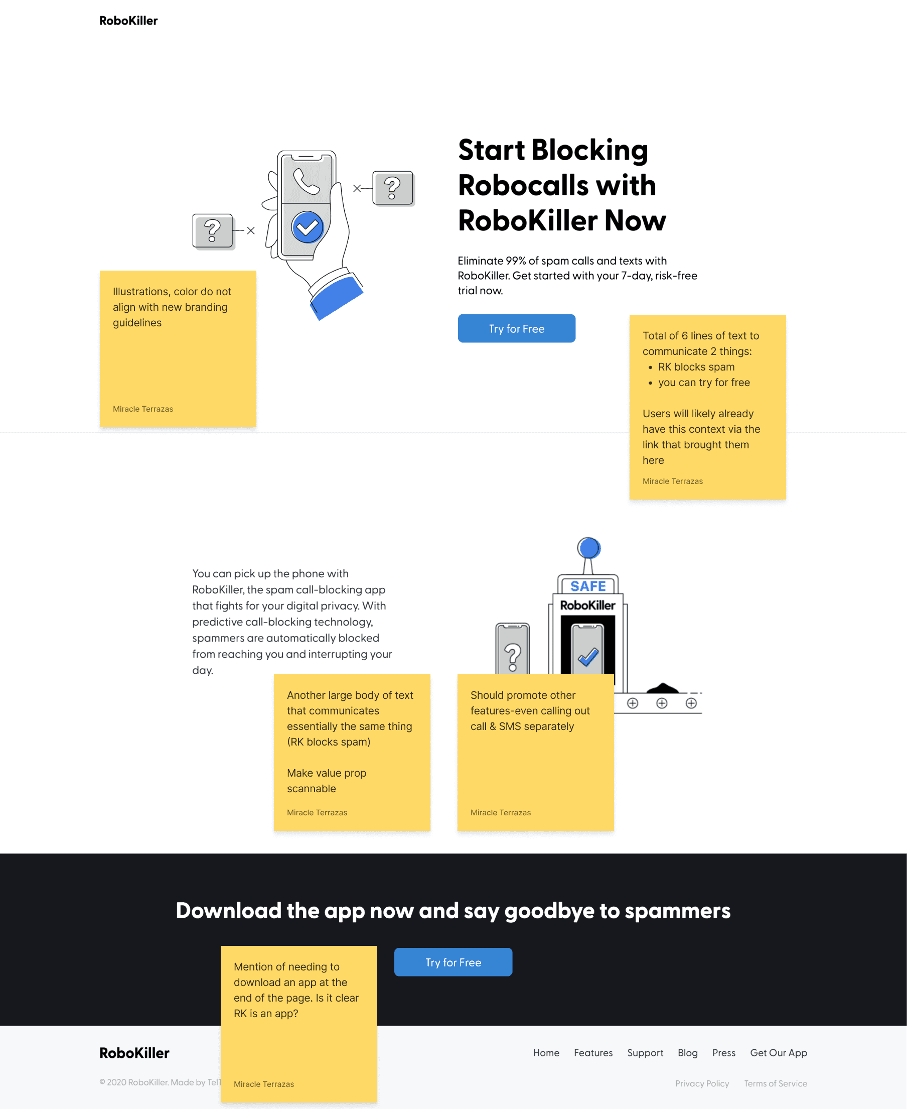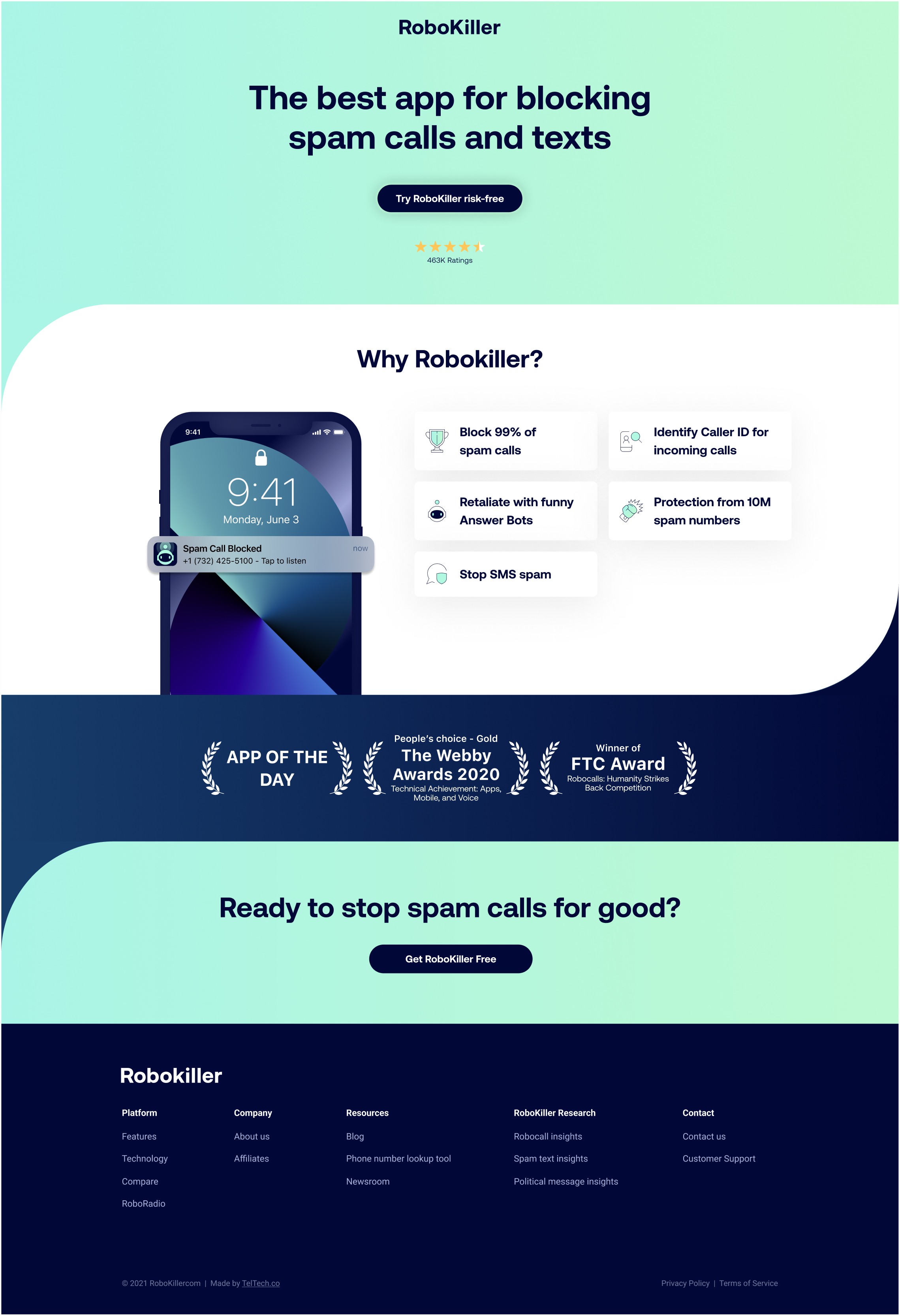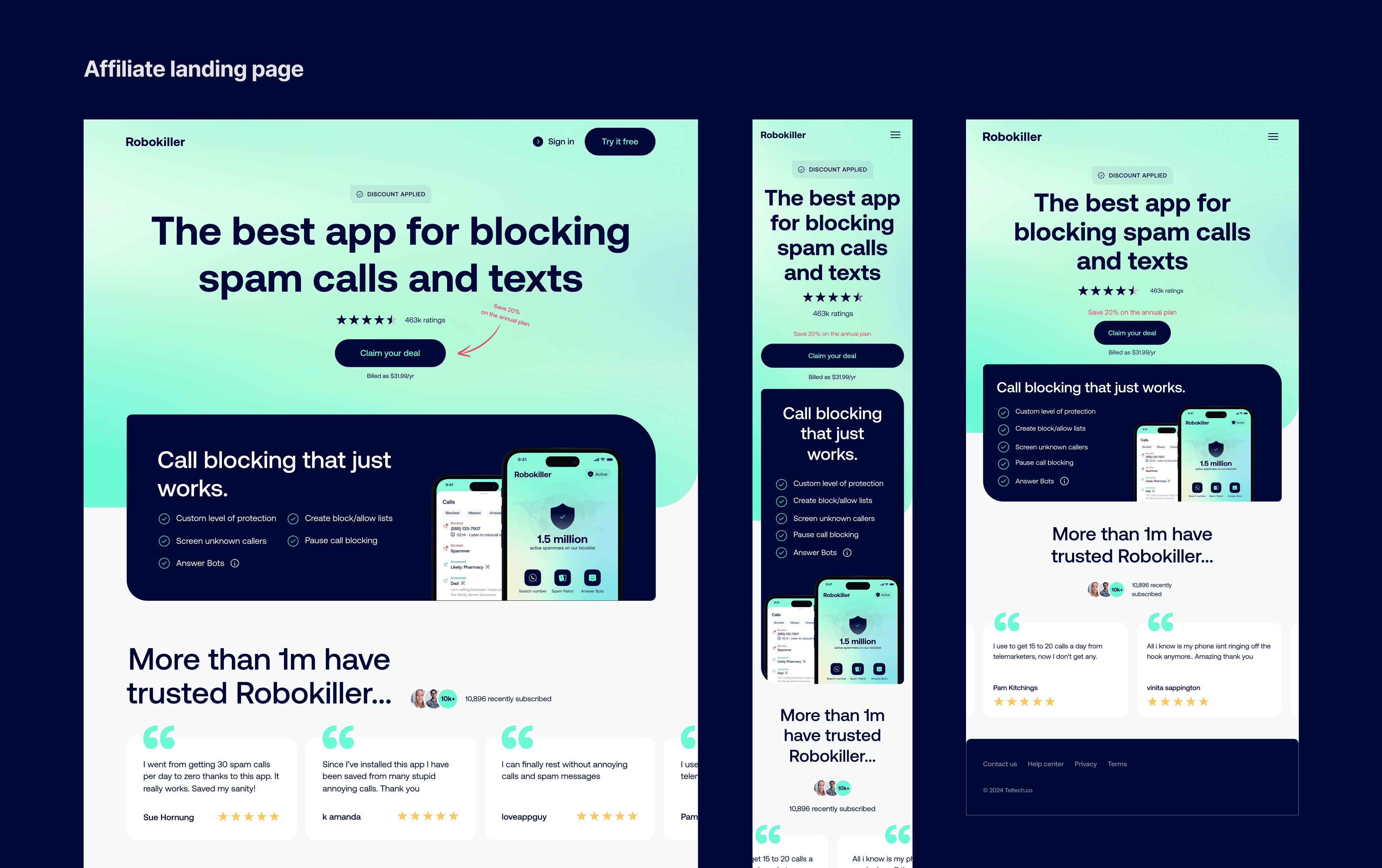 Robokiller is an award-winning spam blocker with a global database of 1.4 Billion analyzed calls backing its industry-leading technology. While at TelTech I designed (Figma) and executed (Webflow) various feature-specific and affiliate landing pages and increased signup funnel conversions with a landing page redesign.
